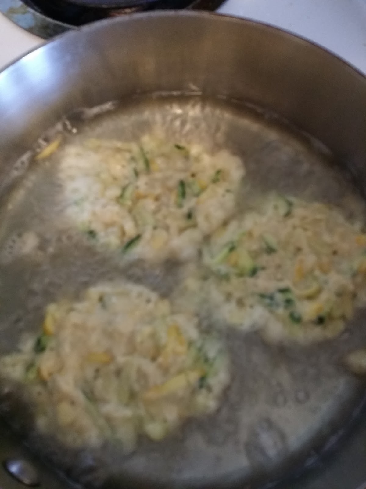 Fry the fritters in about 1/2-inch of oil on medium-high heat. Just until browned on one side. Don't turn the heat up too high or they'll get too brown before the innards are cooked through.