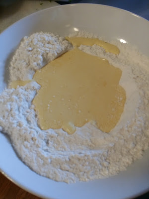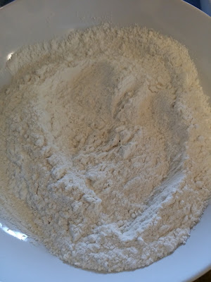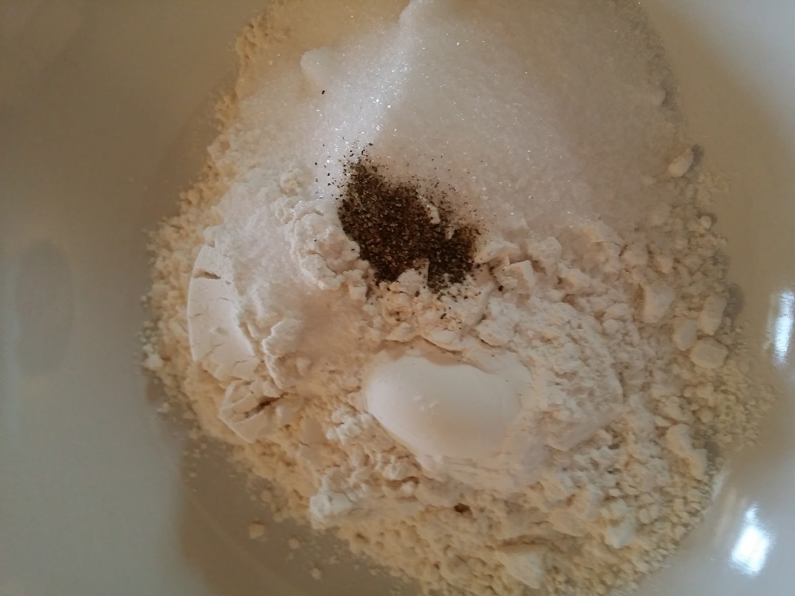 Start with the dry ingredients in a bowl. Flour, sugar, baking powder, salt, pepper.