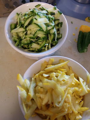 We used the two lovelies he brought home. One small zucchini. One small yellow zucchini. You could use all one kind. Whatever you have will be just fine.