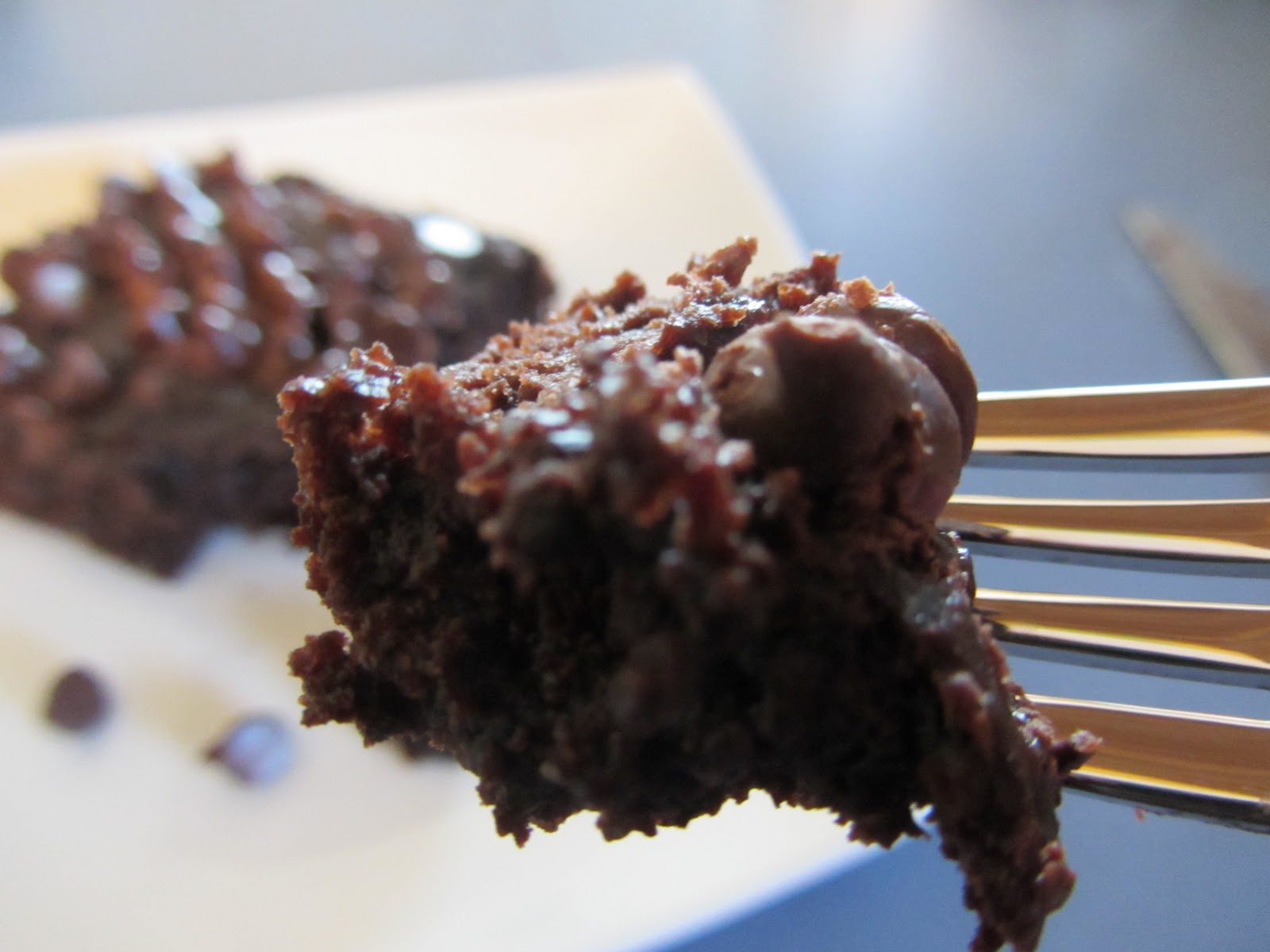 Top with chocolate chips. The more the better. =) The chocolate chips don't sink very far and are the "frosting" of this cake. Mmmmmm..... each bite has a few tiny nuggets of goodness!